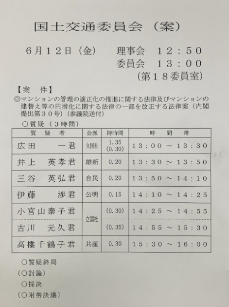 衆議院国土交通委員会「マンション管理適正化法及びマンション建替え円滑化法 改正案 質疑3時間・採決」 ※与党筆頭理事