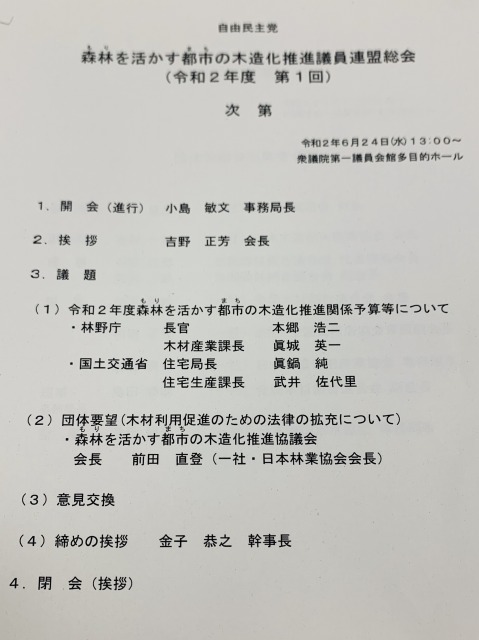 自民党 森林(もり)を活かす都市(まち)の木造化推進議員連盟 総会 ※幹事長