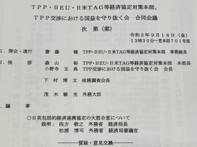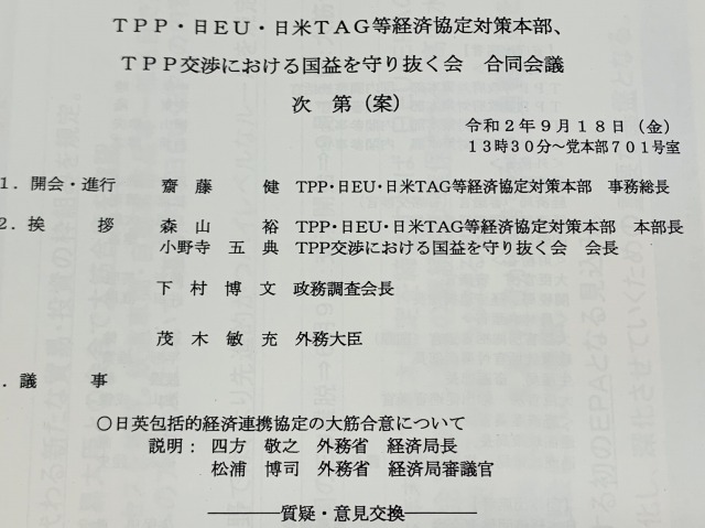 自民党 TPP・日EU・日米TAG等経済協定対策本部、TPP交渉における国益を守り抜く会 合同会議