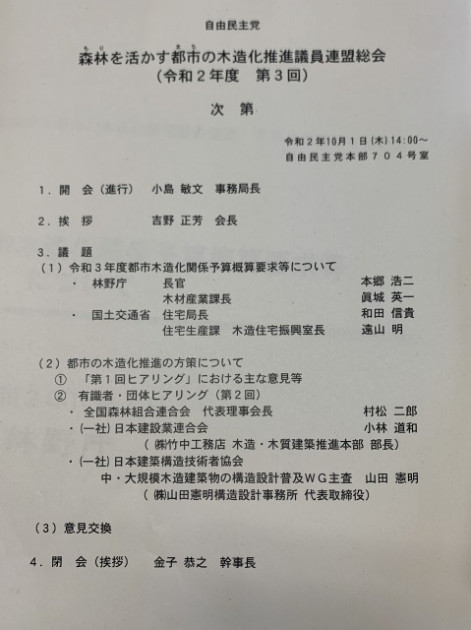 自民党 森林(もり)を活かす都市(まち)の木造化推進議員連盟 総会 ※幹事長