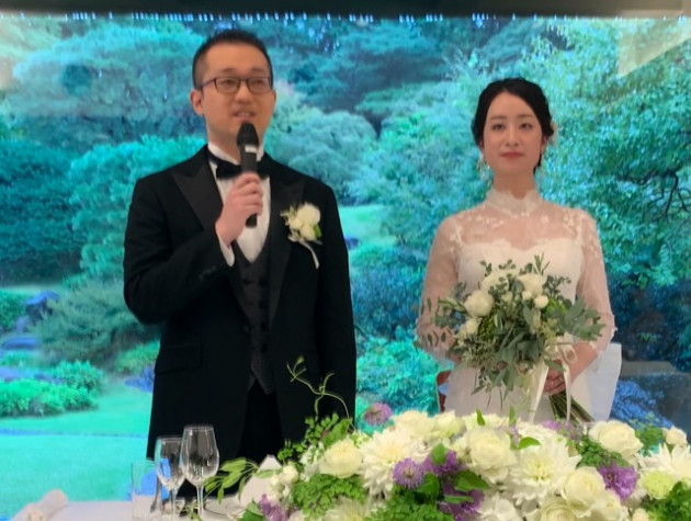栗田駿一郎君〔※早稲田大学在学中4年間、私の国会事務所をインターンとして手伝ってくれました。〕・齊藤奈穂さん結婚披露宴(東京都内)