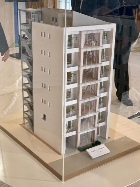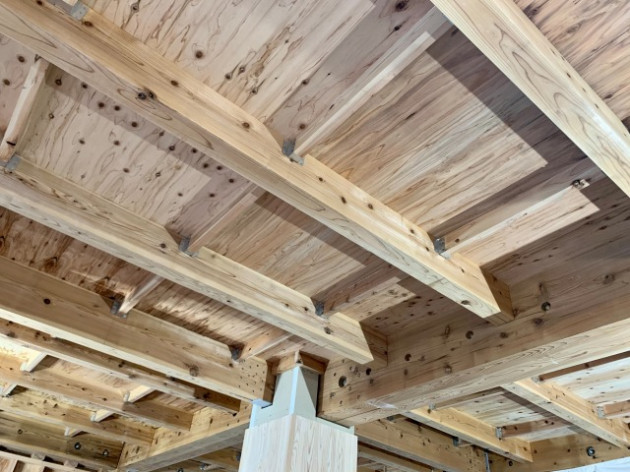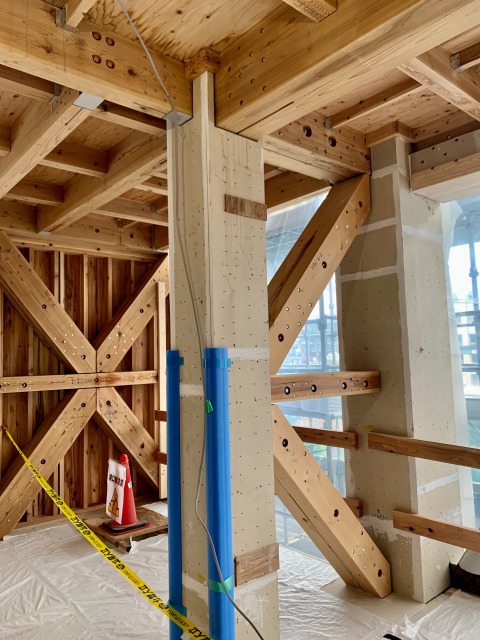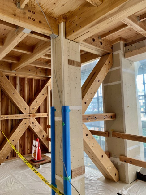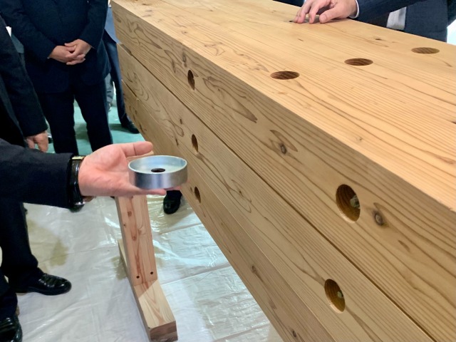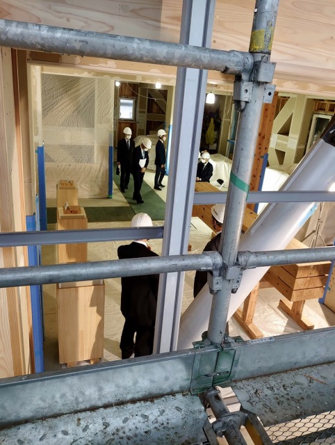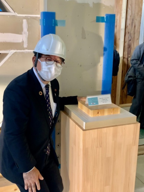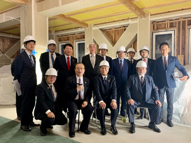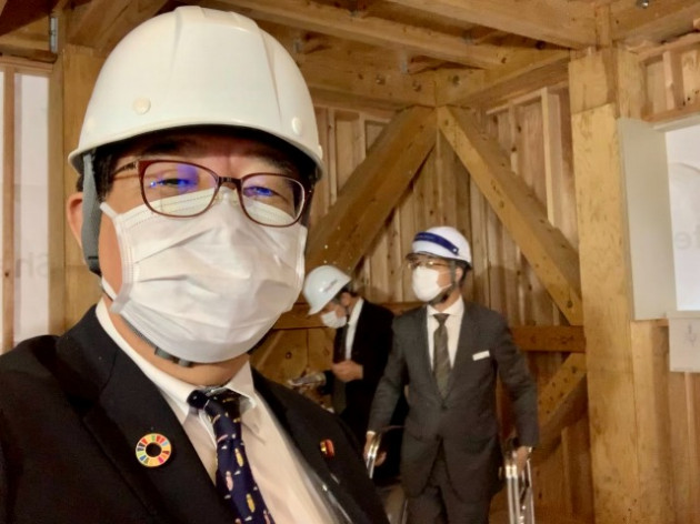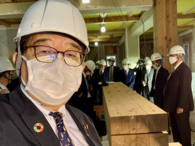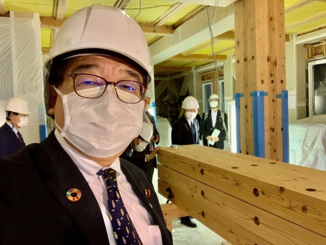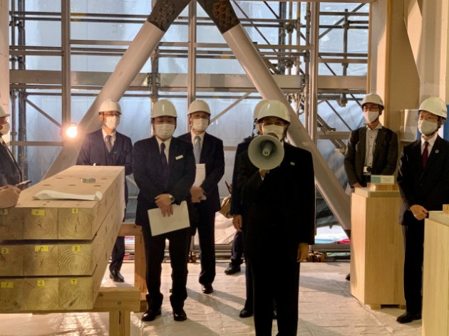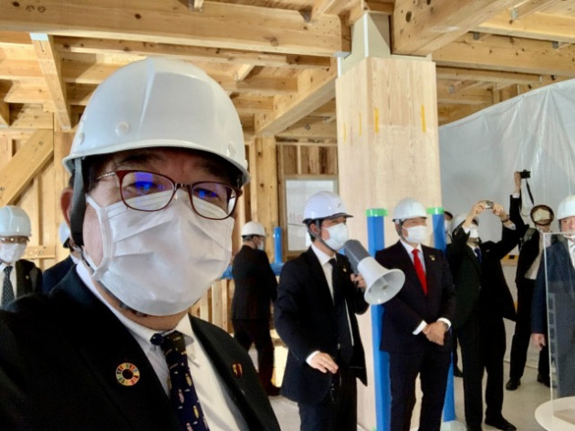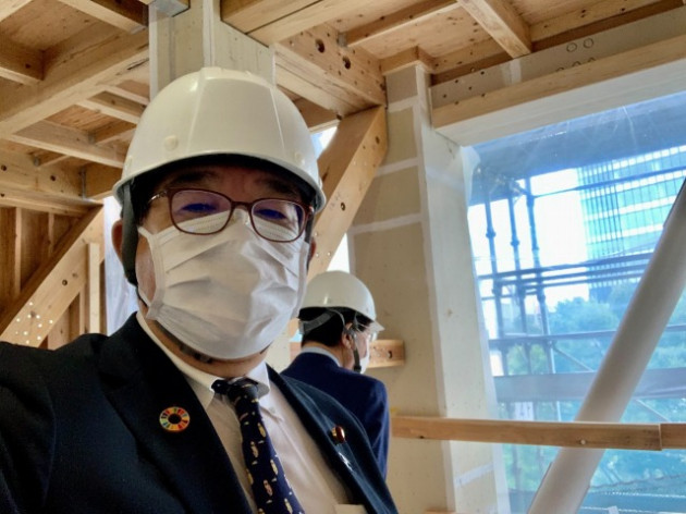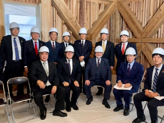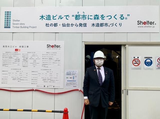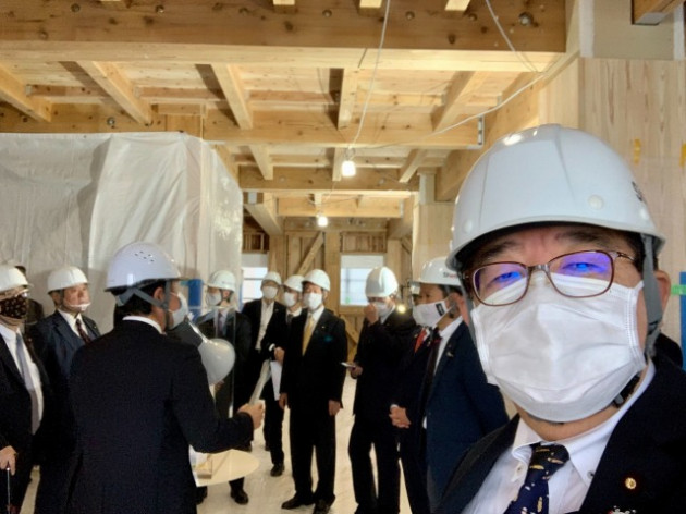 自民党 森林(もり)を活かす都市(まち)の木造化推進議員連盟 「純木造7階建てビル」建設現場 視察(宮城県仙台市内・高惣木工ビル) ※幹事長