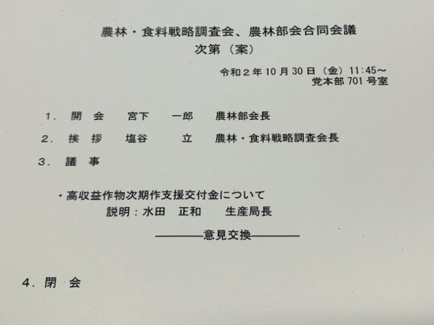 自民党 農林・食料戦略調査会、農林部会 合同会議