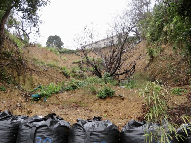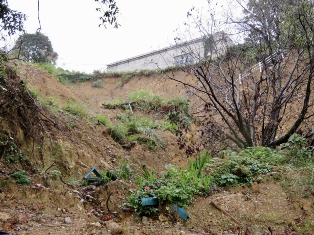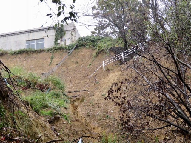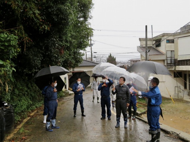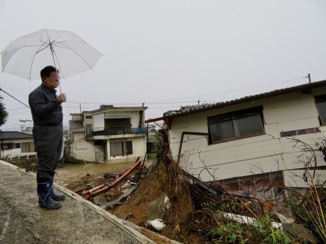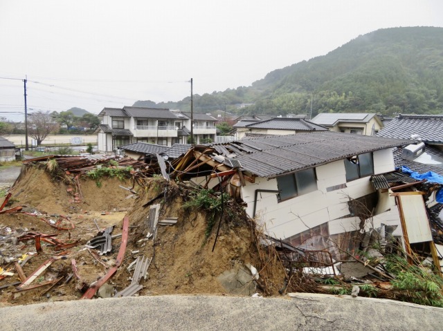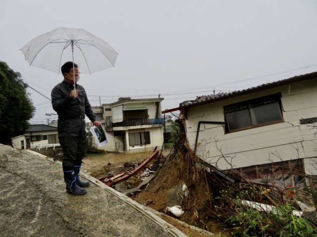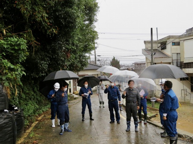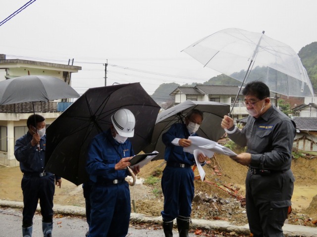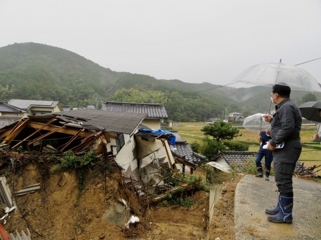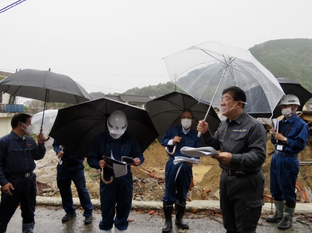 津奈木町「7月豪雨災害箇所②旧 平国小学校下 土砂崩落現場(津奈木町福浜・平国下)」視察 ※津奈木町長、議長、担当課長、荒川県議、熊本県芦北地域振興局長、土木部長、農林水産部長