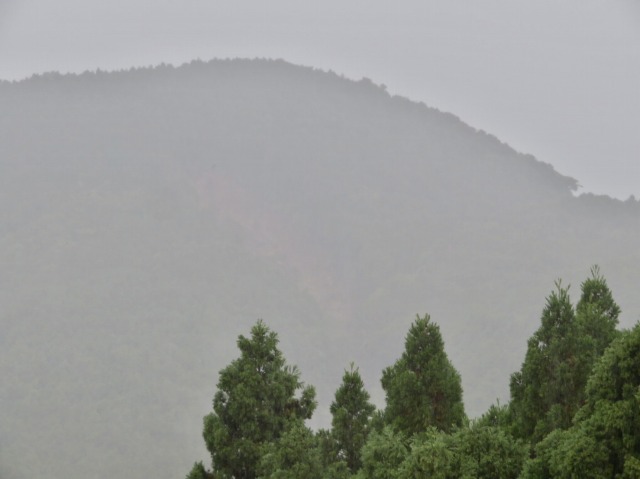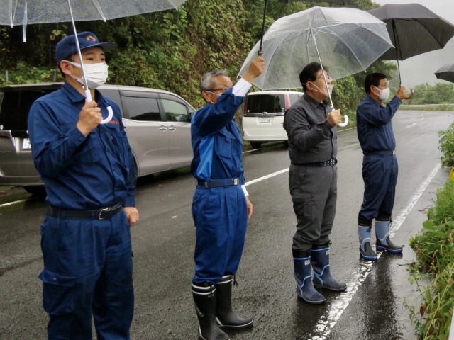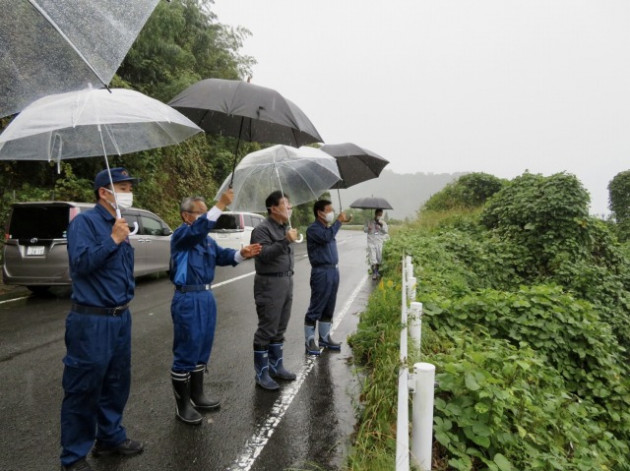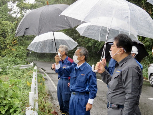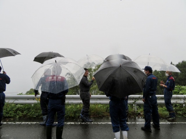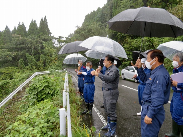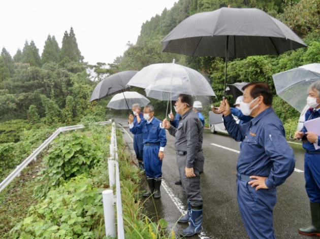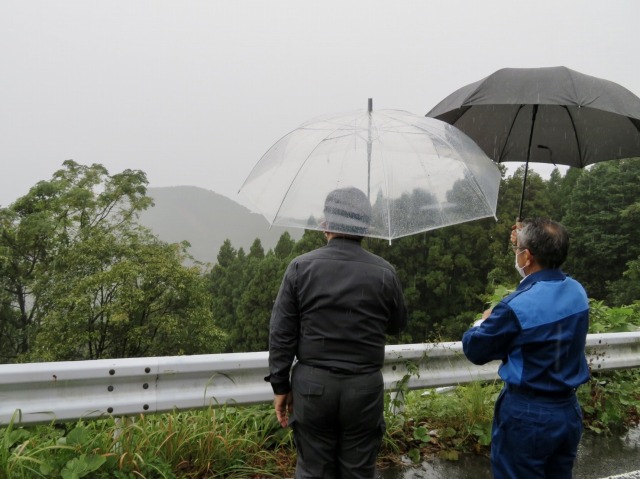 津奈木町「7月豪雨災害箇所③広域農道より①土砂崩落現場を望む(津奈木町・広域農道展望所)」視察 ※津奈木町長、議長、担当課長、荒川県議、熊本県芦北地域振興局長、土木部長、農林水産部長
