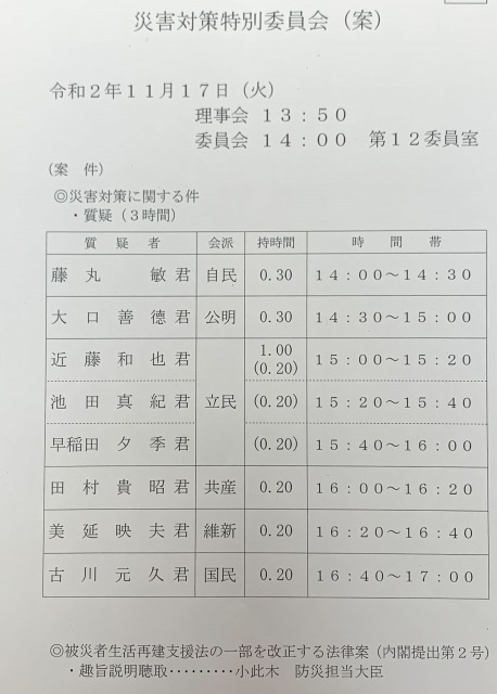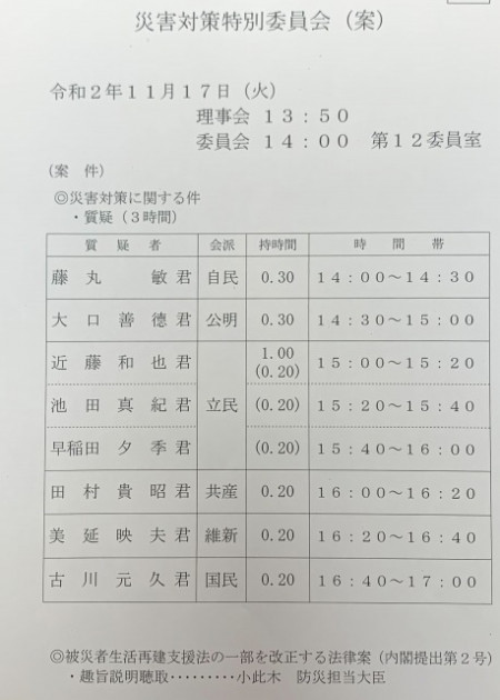 衆議院災害対策特別委員会「大臣所信に対する一般質疑 3時間、被災者生活再建支援法改正案の趣旨説明 聴取」 ※委員長