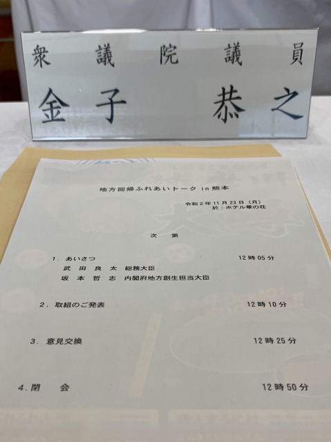 坂本哲志 地方創生担当大臣・武田良太 総務大臣「熊本県 視察」③総務省主催「地方回帰ふれあいトーク」(人吉市内・ホテル華の荘) に同行