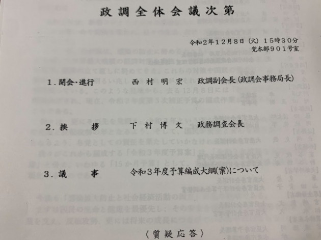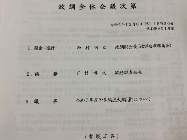自民党 政調全体会議「令和3年度予算編成大綱(案)について」