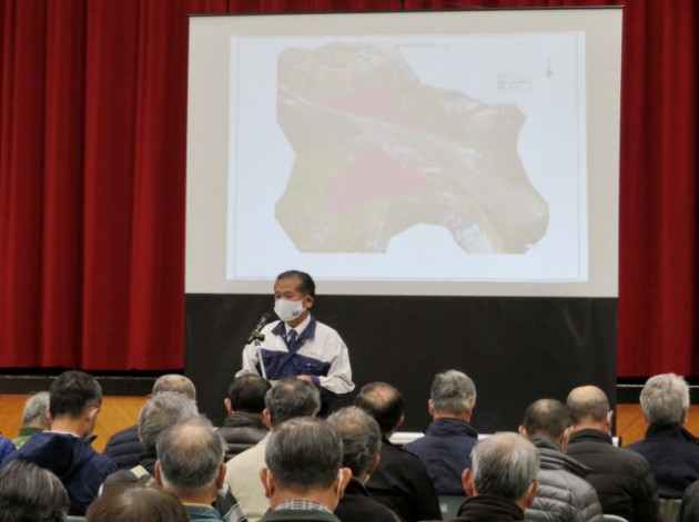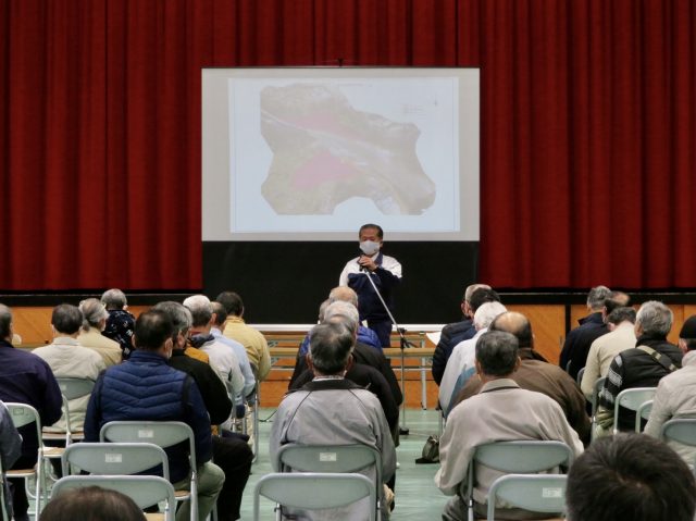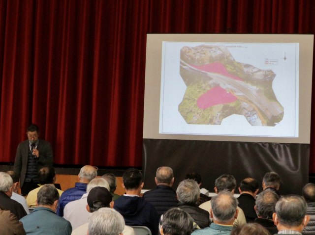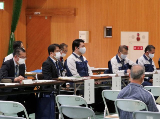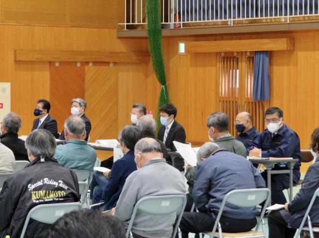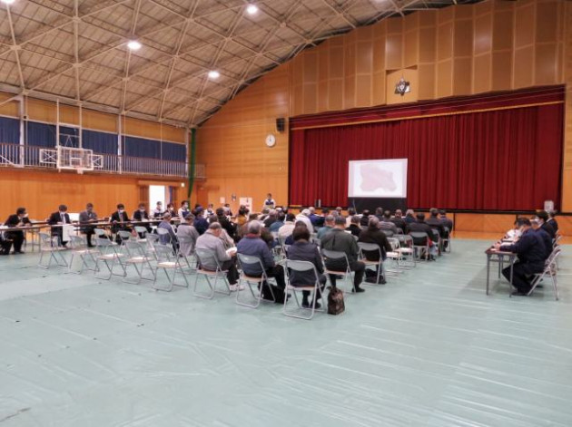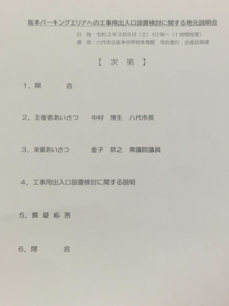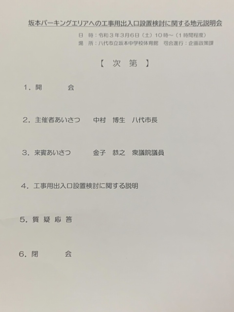 八代市「〔九州縦貫自動車道〕坂本パーキングエリアへの工事用出入口設置検討に関する地元説明会」(八代市立・坂本中学校 体育館)