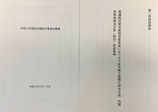 衆議院 災害対策特別委員会「小此木八郎 国土強靭化担当・内閣府特命担当 大臣(防災)の所信、赤沢亮正 国土強靭化担当・内閣府担当 副大臣(防災)の令和3年度防災関係予算概要説明 聴取」 ※委員長