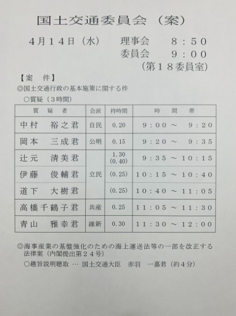 衆議院国土交通委員会「一般質疑3時間、海事産業強化法 趣旨説明 聴取」