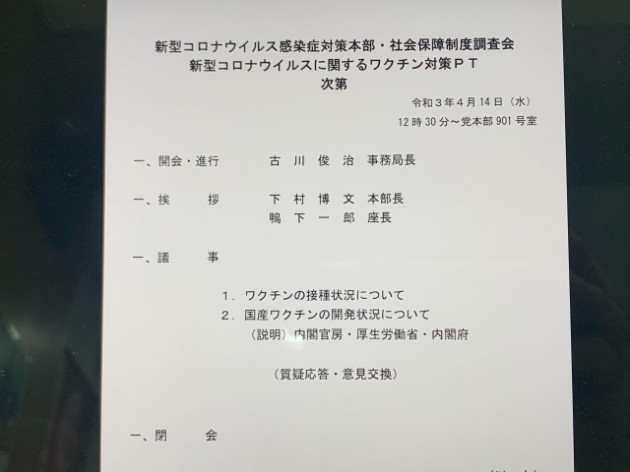 自民党 新型コロナウイルス感染症対策本部・社会保障制度調査会 新型コロナウイルスに関するワクチン対策PT