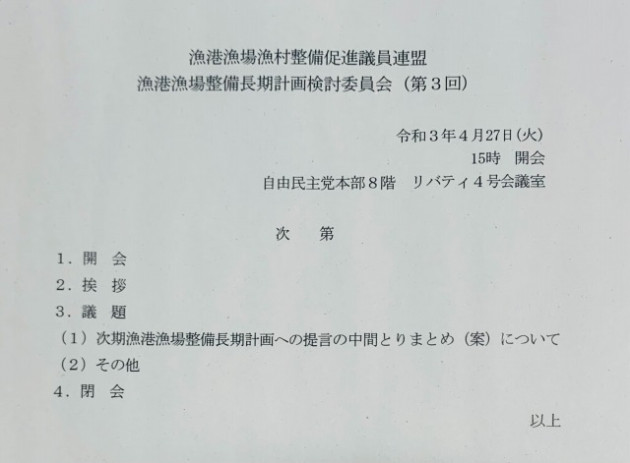 自民党 漁港漁場漁村整備促進議員連盟「漁港漁場整備長期計画検討委員会」 ※自民党 漁港漁場漁村整備促進議員連盟・幹事長