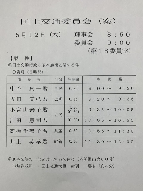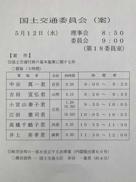 衆議院国土交通委員会「国土交通行政の基本施策に関する質疑 3時間、航空法改正案 趣旨説明聴取」