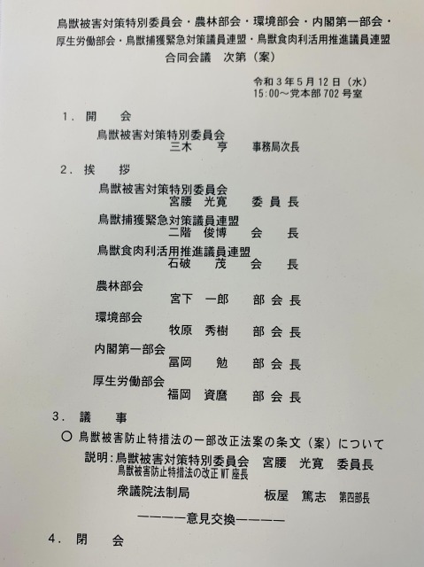 自民党 鳥獣被害対策特別委員会・農林部会・環境部会・内閣第一部会・厚生労働部会・鳥獣捕獲緊急対策議員連盟・鳥獣食肉利活用推進議員連盟 合同会議
