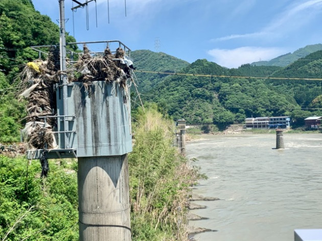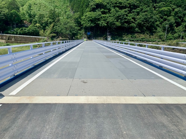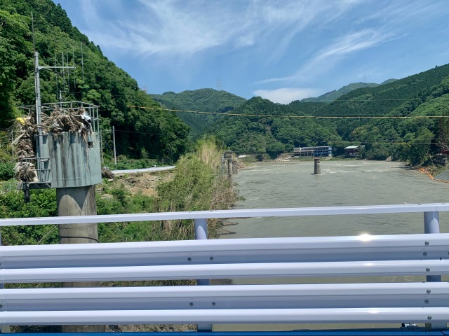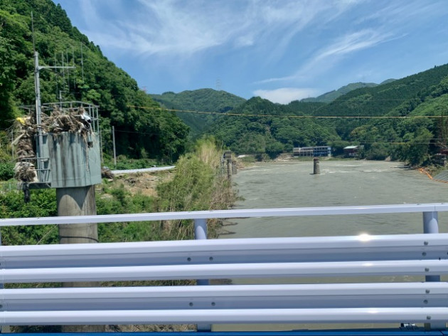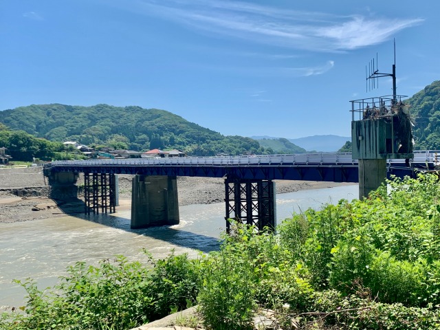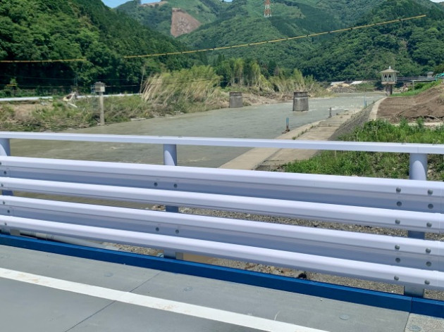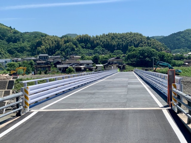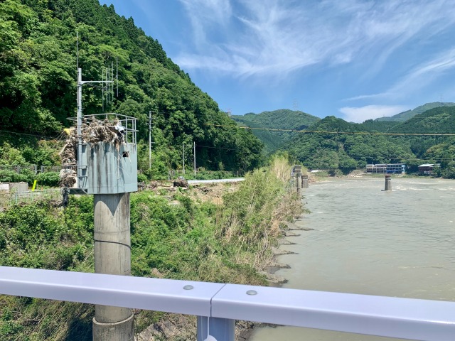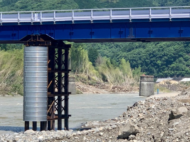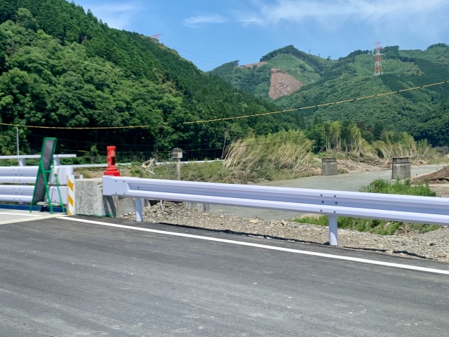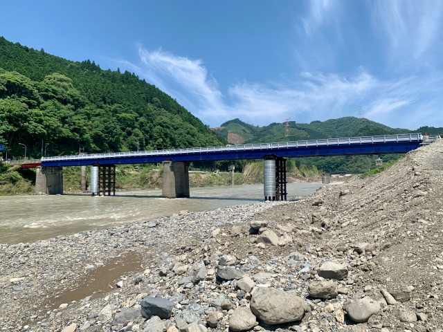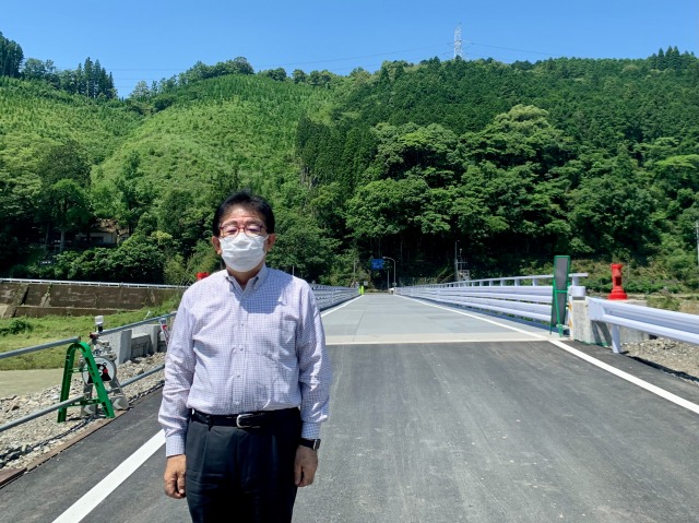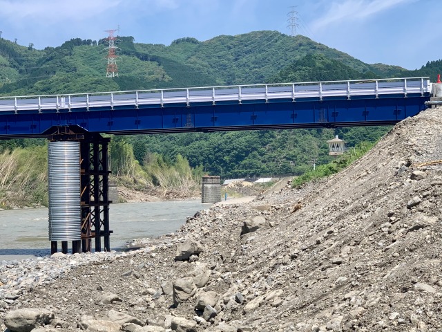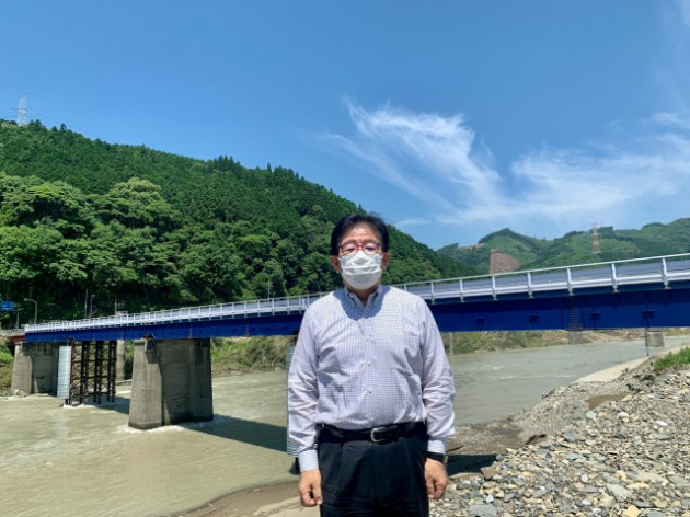 〔令和2年7月豪雨災害〕災害復旧事業箇所〔5月21日に仮橋で通行再開した相良橋(仮橋)〕を視察(球磨村渡地区)