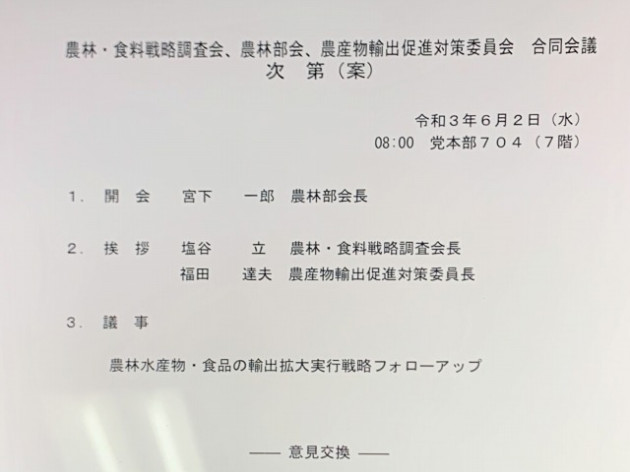 自民党 農林・食料戦略調査会、農林部会、農産物輸出促進対策委員会 合同会議