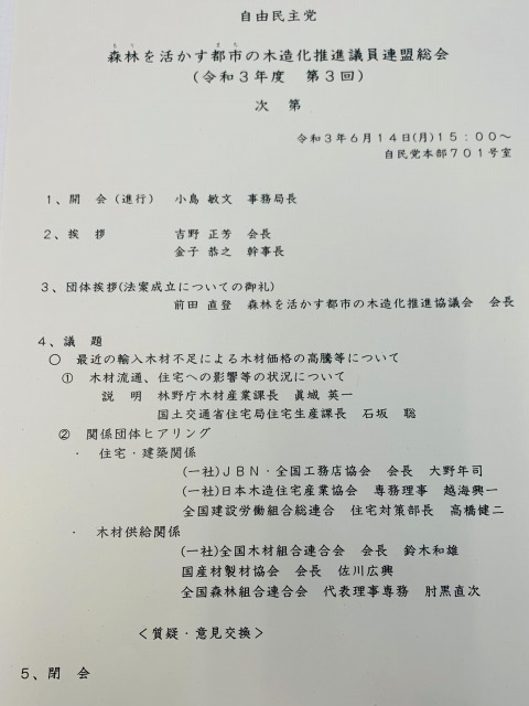 自民党 森林(もり)を活かす都市(まち)の木造化推進議員連盟 総会 ※幹事長