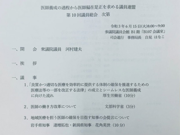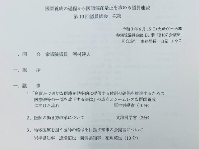 自民党「医師養成の過程から医師偏在是正を求める議員連盟」議員総会