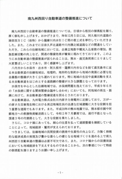南九州西回り自動車道建設促進協議会・南九州西回り自動車道建設促進期成会・熊本県議会県南振興議員連盟・鹿児島県議会南九州西回り自動車道建設促進議員連盟・(国会)南九州西回り自動車道建設促進議員連盟『南九州西回り自動車道の整備推進〔オンライン要望〕』(財務省・奥 主計局次長) ※(国会)南九州西回り自動車道建設促進議員連盟・会長