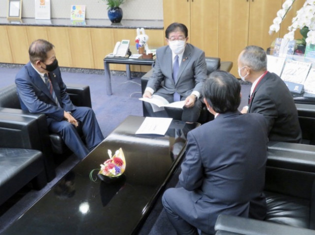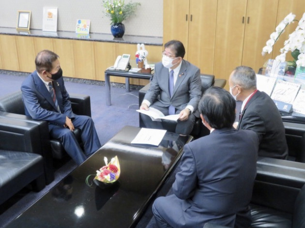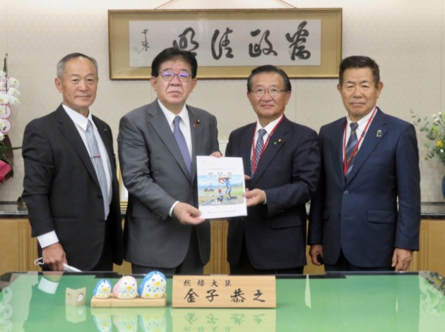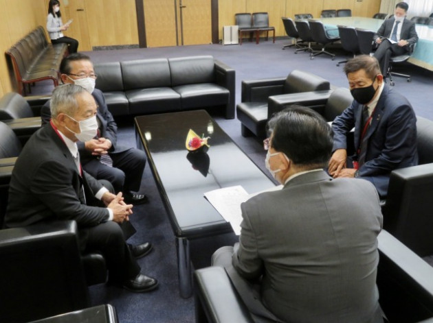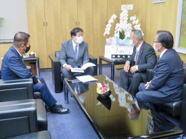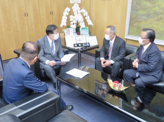 熊本県土地改良区事業推進連絡協議会・甲斐会長〔一の宮町土地改良区 理事長〕、岡村副会長〔百太郎溝土地改良区 理事長〕、玉名平野土地改良区・高嵜理事長 要望来室(総務大臣室)