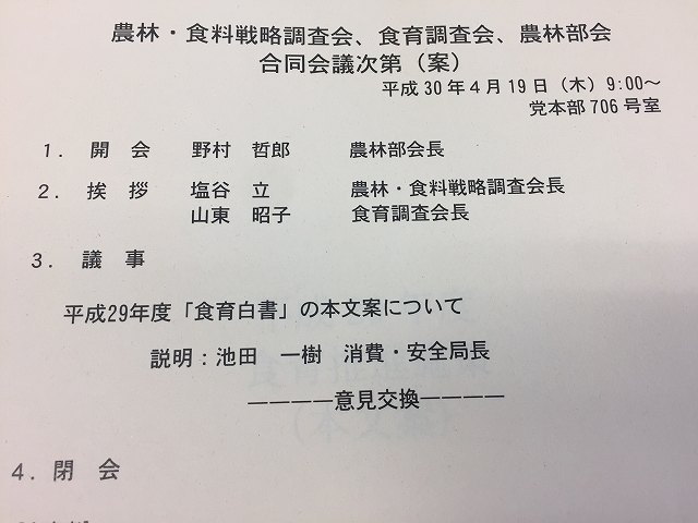 自民党 農林・食料戦略調査会、食育調査会、農林部会 合同会議