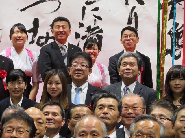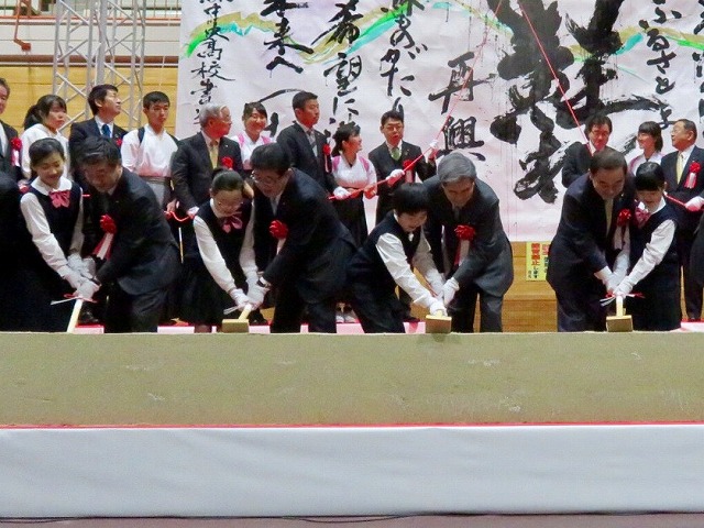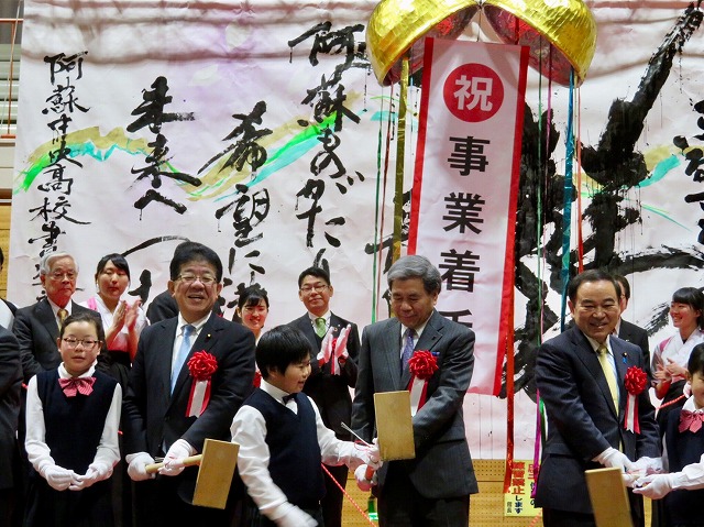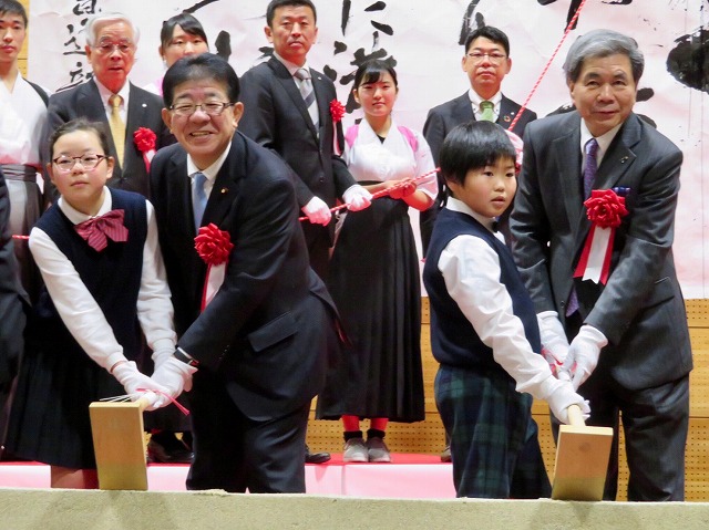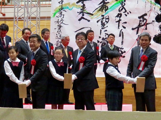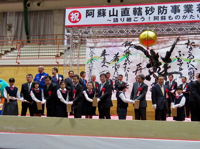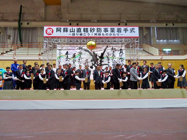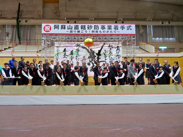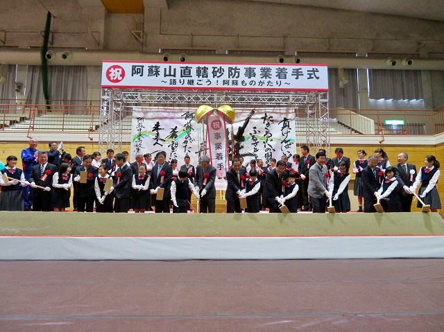国土交通省主催「阿蘇山直轄砂防事業 着手式」(阿蘇市立 阿蘇体育館) ※鍬入れ・くす玉開披