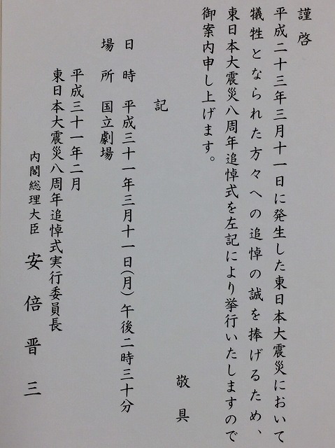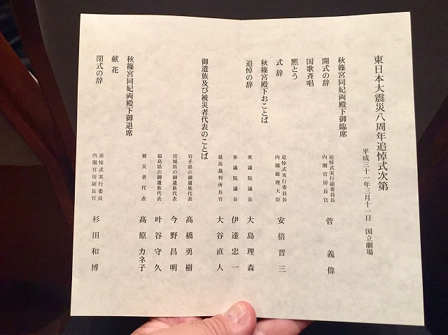政府主催「東日本大震災八周年追悼式」(国立劇場)