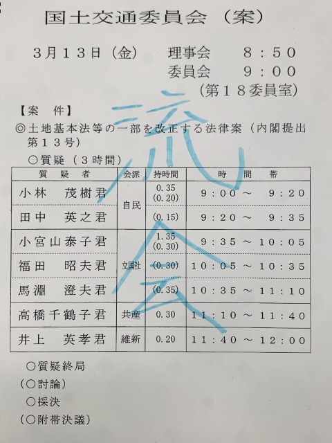 衆議院国土交通委員会 午前中、待機 → 流会