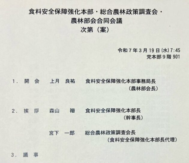 自民党 食料安全保障強化本部・総合農林政策調査会・農林部会 合同会議 ※食料安全保障強化本部 副本部長