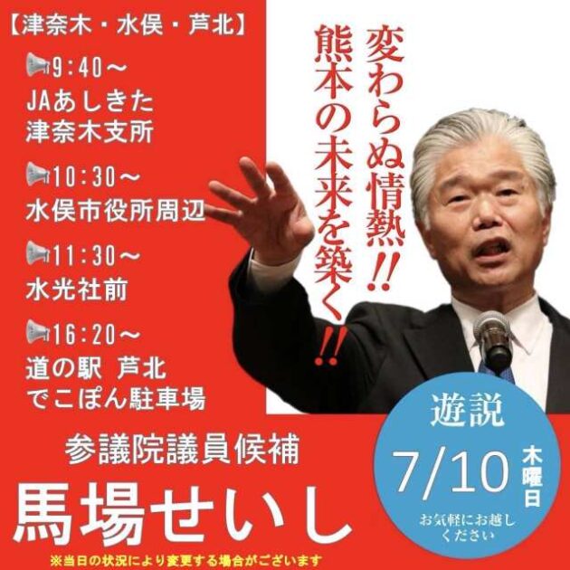 〔 参議院議員 選挙 8日目 〕馬場せいし候補「 津奈木町・水俣市・芦北町 遊説 」に熊本4区選挙長として同行