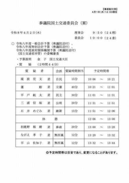 参議院 国土交通委員会「 令和8年度予算案 委嘱審査 」 ※午前の部 2時間6分